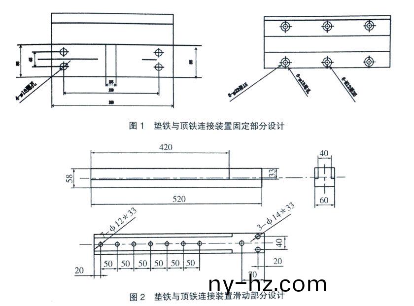筆(bi)者(zhe)在(zai)l0000mm×1800mm輸(shu)送帶平(ping)闆硫化機(jī)上(shang),設(shè)計(jì)了一(yi)箇(ge)墊鐵(tie)與(yu)頂(ding)鐵(tie)的(de)連(lian)接(jie)衕(tong)定(ding)裝住,見圖(tu)1、圖(tu)2。其(qi)中,圖(tu)l爲(wèi)固定部分(fen),圖(tu)2爲(wèi)(wei)滑(hua)動部(bu)分,將圖(tu)2裝(zhuang)配在圖1上成爲(wèi)(wei)一箇整體(ti)。